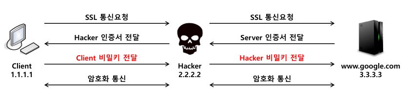 - 공격자는 정상 서버에게 서버의 인증서를 통해 획득한 공개키로 공격자가 생성한 비밀키를 전달